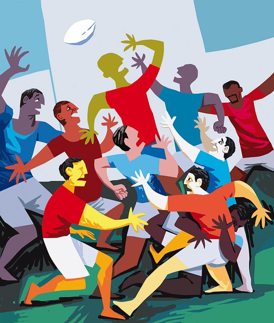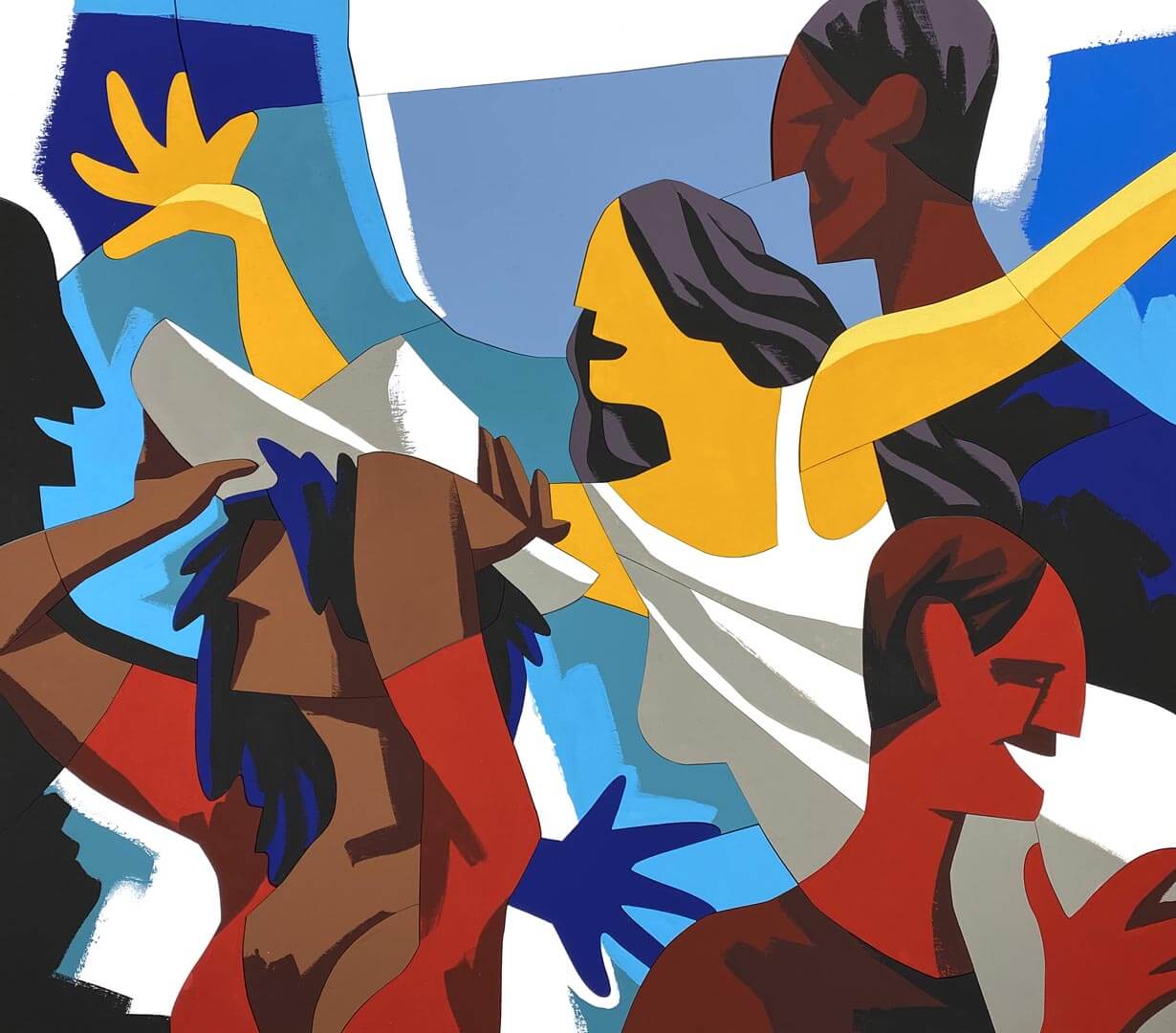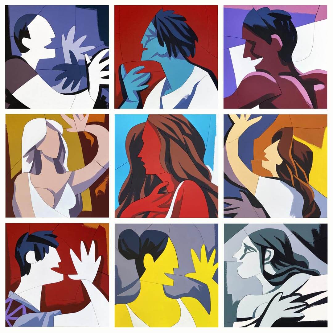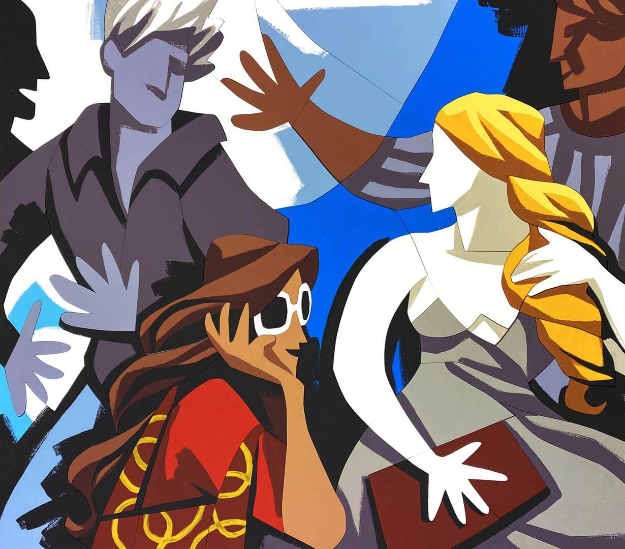 One person on the painting is yellow, a next one is green and another one is purple; they differ between one another exactly like is human beings, unique in their emotions, infinite like colours.